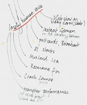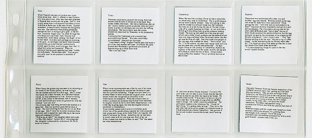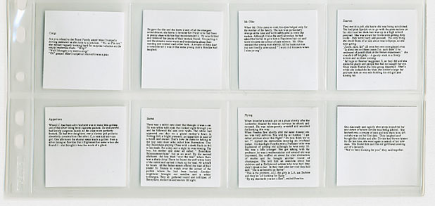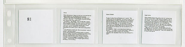 Marcia Farquhar: 81 Stories (text work and sound installation) - voices include Marcia Farquhar, Dorian McFarland, Jon Thompson and Stuart Brisley, London 1998