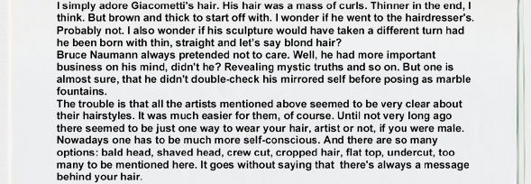 Wood's ventures into hairdressing manuals and Trine Nedreaas' startling demonstration of the unbecoming comb-over.