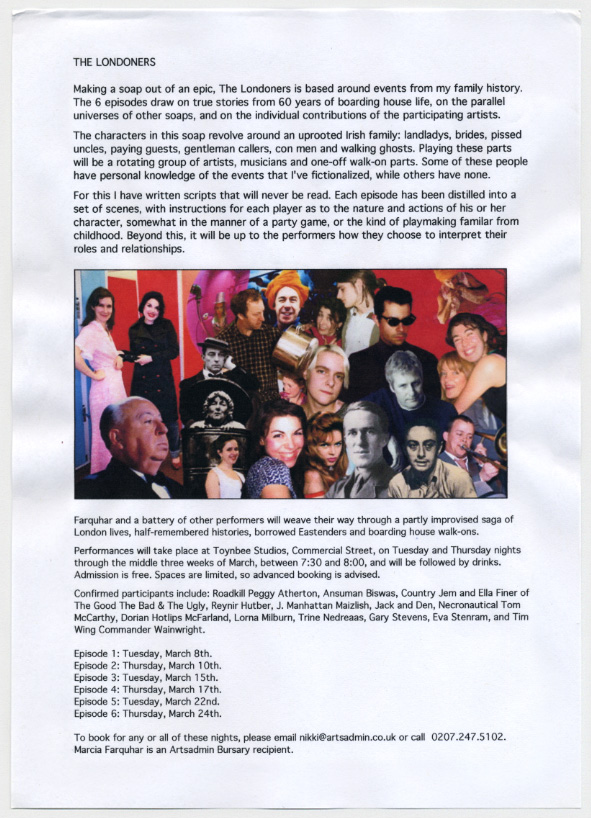 Marcia Farquhar: The Londoners, a live soap in six episodes, Toynbee Hall, London, March 2005. Theme song "The Londoners" by Marseille Figs.